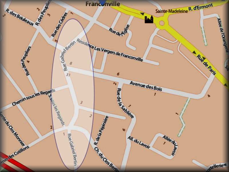 Noms de baptêmes successifs : Sur le plan de 1732, figure sous le nom de rue de Buchet et ruelle de la Pissotte, ainsi nommée car l'eau y dévalait de la côte, (H. Mataigne). Ancienne rue d’Argenteuil Origine du nom : Gabriel Bertin, né à Franconville le 13 février 1853, marié le 18 juin 1874 et décédé le 13 novembre 1914. Était conseiller municipal sous Toussaint Lucas en 1888.