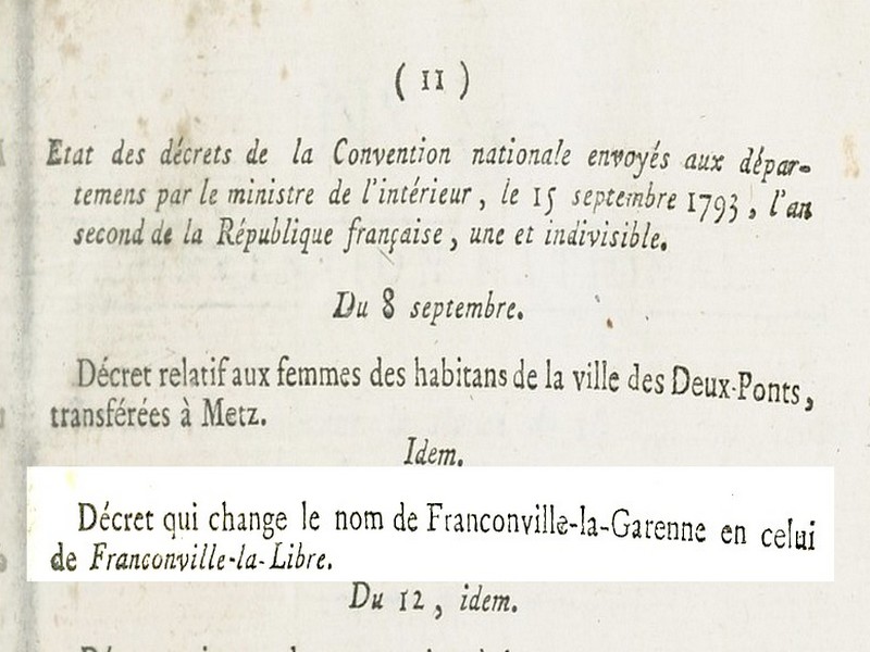 Dès le 8 septembre 1793, la Société Populaire avait remis à la Convention Nationale une motion, afin de changer le nom de la commune. La Convention décréta le jour même qu’elle se nommerait "Franconville la Libre". La municipalité n’avait pris aucune part à cette décision et le maire en fut avisé le 4 octobre. Il fut décrété que les citoyens devront porter la cocarde tricolore sur le coté gauche de la tête, sous peine d’être suspectés d'anti-révolutionnaires, arrêtés et emprisonnés.
