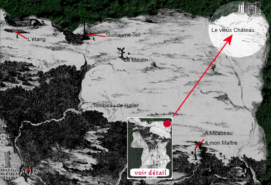Cette description ne correspond pas à la gravure due à la Comtesse d’Albon, qui ne représente que des ruines. Sur la gravure représentant l’enlèvement du « ballon de Franconville » figure une sorte de grande bâtisse carrée qui ressemble étrangement au vieux château décrit par Dulaure et sur lequel devait être l’observatoire. A l’extrême droite de la gravure se profile le clocher de Franconville, mais suivant le plan nous constatons que c’est le château neuf, et non le vieux château celui-ci étant à l’autre extrémité de la colline.