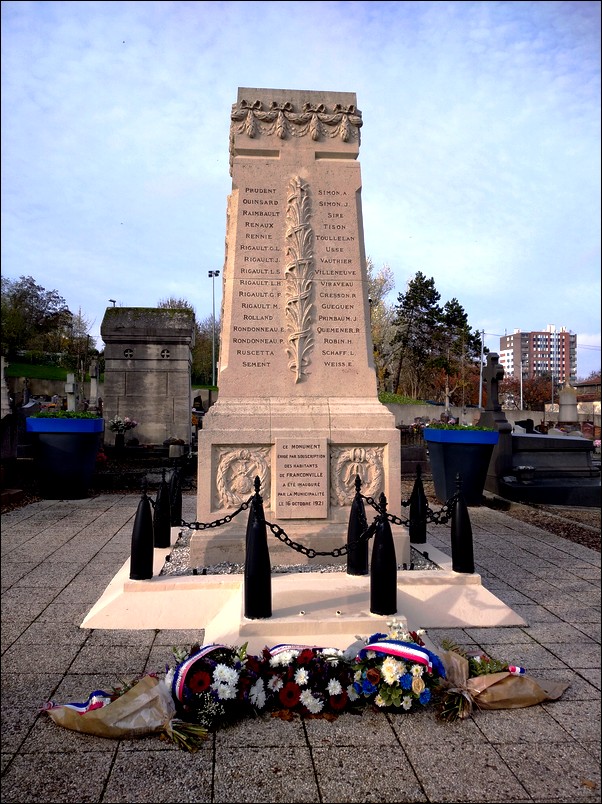 De l’allée principale, nous nous dirigeons vers le monument du souvenir, sur chacun des cotés s’alignent les tombes de soldats morts durant la première guerre mondiale. Sur le carré dallé se dresse le monument aux morts. Il fut conçut par l’architecte P. Godefroy et le sculpteur Raphaeli. Inauguré le 16 octobre 1921, nous lisons sur les quatre faces le nom de 123 enfants de Franconville morts pour la patrie. Cette liste fut actualisée par la suite à 131 noms. Sur le monument, deux épitaphes de Victor Hugo. Le jour de l’inauguration, trois cérémonies auront eut lieu :