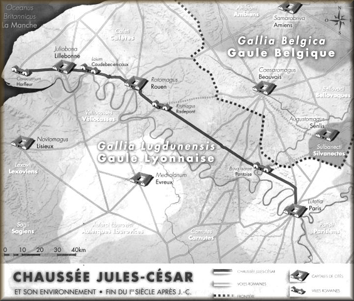 Voie romaine qui reliait Lutèce (Paris) à Rotomagus (Rouen). Mentionnée sur la Carte de Peutinger et l'Itinéraire d'Antonin, la voie qui reliait Lutetia (Paris) à Rotomagus (Rouen) par Briva Isara (Pontoise) a été identifiée au tracé remarquable de la chaussée Jules-César qui parcourt le plateau du Vexin français, dans le Val-d’Oise. Construite à partir du premier quart du ier siècle dans le cadre du vaste réseau routier aménagé par Rome en Gaule, elle se poursuivait jusqu’à l’estuaire de la Seine à Juliobona (Lillebonne) puis rejoignait la Manche, probablement à Caracotinum (Harfleur). Dans le Vexin français, la voie est conservée sous la forme d’un chemin étonnamment rectiligne qui desservait plusieurs villages et hameaux, et elle constitue l'un des principaux vestiges antiques du Val-d’Oise. En amont, elle a été dénommée sentier des Callais avant les marais de Soisy, chemin du Digne-Chien à Enghien, et parfois chemin ferré avant Pontoise. Remarques : Le 2 mars 1929, la chaussée Jules César est empierrée et raccordée au tout à l'égout. Le 10 avril 1952, viabilisation entre la rue du Plessis Bouchard et le bois de Boissy. Le 14 septembre 1955, fin de la viabilisation.