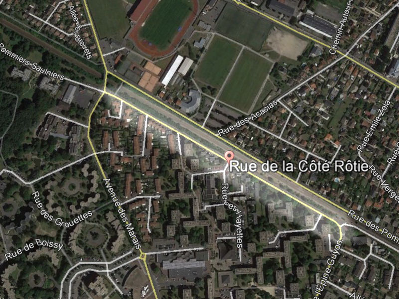 Statut : Voie communale. Longueur : 573 m. Largeur : 6 m. Début : Avenue des Marais. Fin : Rue de l'Epine Guyon. Période de création : Sur le plan d’urbanisme de l’aménageur les rues sont dénommées dès 1964. Nom précédent : Chemin Latéral Sud. Origine du nom : Porte le nom d’un lieu dit.