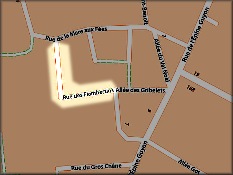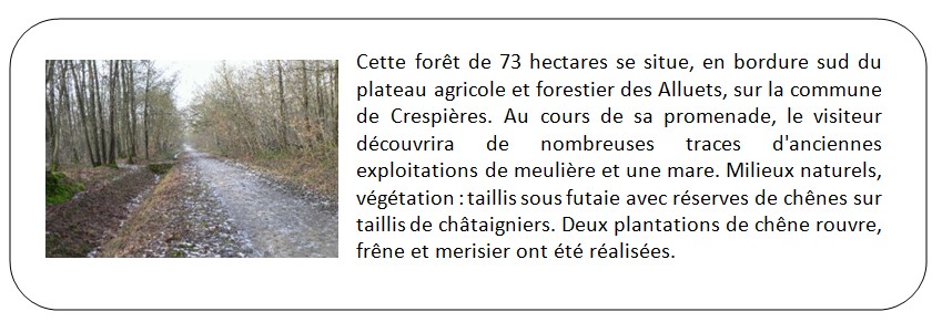 Statut : Voie privée impasse. Longueur : 45 m. Largeur : 6 m. Début : Rue de la mare aux Fées. Période de création : Sur le plan d’urbanisme de l’aménageur, les rues sont dénommées dès 1964. Origine du nom : Nom d'un hameau et d'une forêt de Crespières, commune du département des Yvelines.