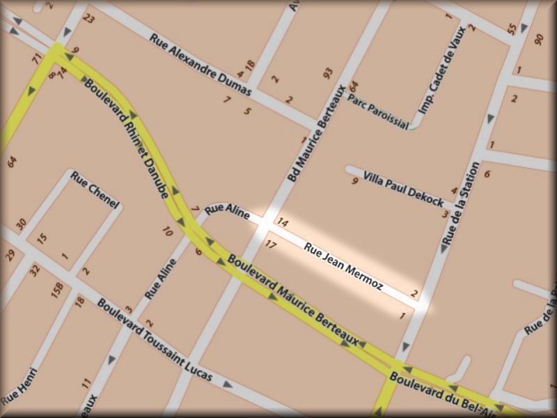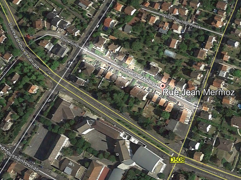 Statut : Voie communale. Longueur : 145 m. Largeur : 5 m. Début : Rue de la Station. Fin : Boulevard Maurice Berteaux. Période de création : Inaugurée le 11 juillet 1937, devient voie communale le 27 Septembre 1947. Nom successif : Sur un plan de 1947, la rue Jean Mermoz figure sous le nom d'Emile Rivoire. Origine du nom : Jean Mermoz est né à Aubenton (Aisne) le 9 décembre 1901 et trouve la mort dans l'océan Atlantique le 7 décembre 1936. Aviateur français, figure légendaire de l', où il commence comme mécanicien. Il est surnommé l'«». En avril 1920, il est affecté en qualité de pilote sur la ligne Toulouse-Barcelone, ligne qui franchit les Pyrénées, défi pour les avions de l'époque. En 1925, Mermoz assure la liaison Barcelone-Malaga. En 1926, il prend en charge le courrier sur la liaison Casablanca-Dakar.