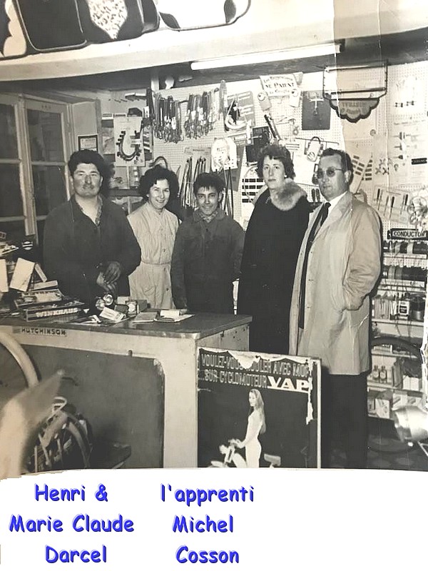 Vient ensuite une cour dans laquelle se trouvait Monsieur BRICHET, matelassier qui refaisait nos matelas chez lui ou bien à notre domicile.Nous trouvons ensuite :- Un magasin de cycles et motos, Monsieur Henri DARCEL, concessionnaire Alcion, VAP, Motobécane, successeur de Monsieur AMEDURY depuis les années 1958/1959,