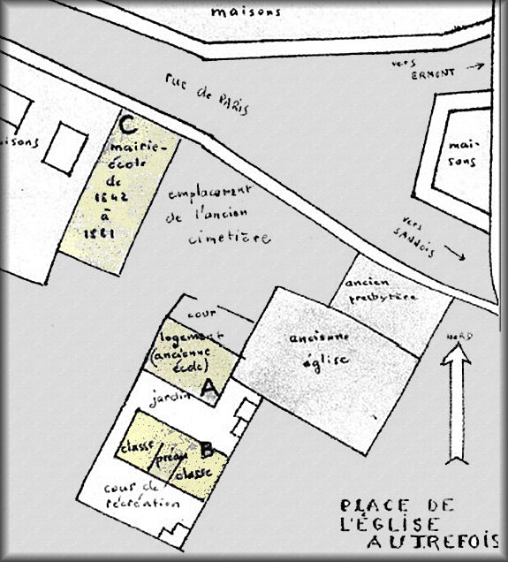 Revenons à l’école des garçons restée dans le presbytère. Dès 1836, le conseil désirant doter la commune d’une école convenable pour les garçons, achète une maison située prés de l’église, en bordure de l’ancien cimetière. Démolie, elle est remplacée par la mairie-école (photo de droite), la place entre elle et l’église devenant cours de récréation et place de réunion. Cette construction, qui a en totalité 14 mètres de long sur 6 de large, comprend au rez-de-chaussée une salle de classe d’environ 8 mètres sur 6 et un corps de garde s’ouvrant sur la place. Deux escaliers donnent accès, l’un aux appartements de l’instituteur et l’autre à la mairie située au 1er étage. Celle ci se compose d’une salle du côté de la rue de Paris où elle se prolonge par un balcon et d’un cabinet noir. Le logement de l’instituteur comprend 3 pièces et un cabinet. Au dessus se trouve un grenier dans lequel sont aménagées deux petites chambres. Une cave du presbytère reste à la disposition de l’instituteur. Cette mairie école est mise en service en 1842 (bâtiment C du plan 1)