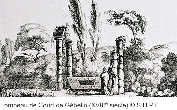 Lorsque Gebelin mourut en mai 1784 il fut enterré dans le cimetière protestant parisien. Le Comte d’Albon faisant valoir son amitié et la renommé de ce savant, afin de lui donner une sépulture digne, demanda de le faire exhumer Lorsqu’il en fit la demande au roi celui-ci aurait répondu «que Monsieur d’Albon ferait mieux de payer les dettes de Monsieur de Gebelin » Il fit transporter le corps dans ses jardins et l’inhumation eut lieu le 10 juillet 1784. Après l’avoir fait mettre dans un cercueil de plomb il lui fit construire un tombeau orné de quatre stèles funéraires, sur l’une des colonnes il avait fait graver : «Passant, vénérez cette tombe, Gebelin y repose » Le tombeau fut profané à la Révolution française, la trace n’en est plus visible.