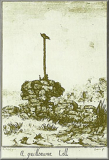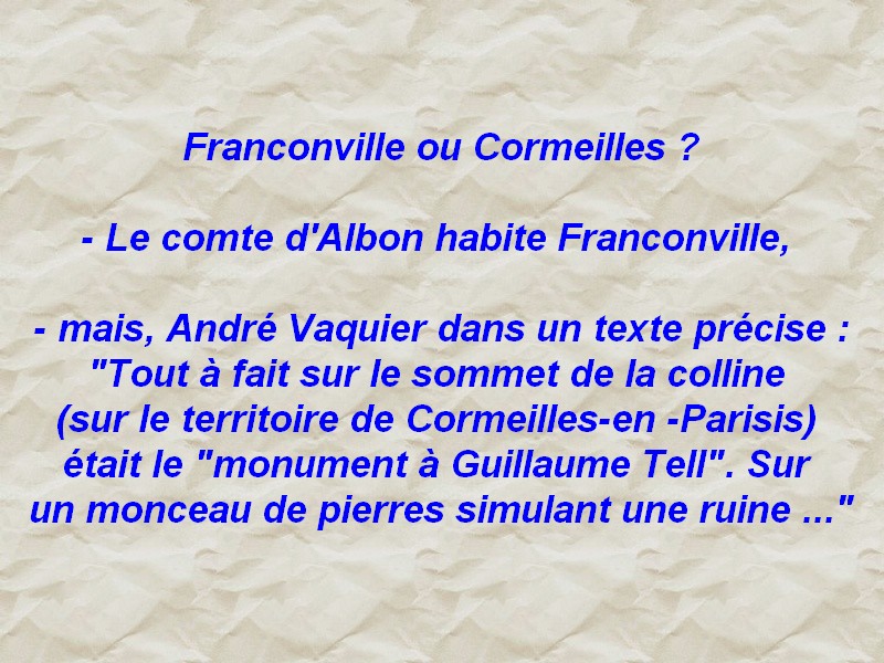 C’est ainsi qu’en 1782 au sommet de la colline et en son milieu sur un monceau de pierres, simulant une ruine, il avait dressé un long mat couronné d’un chapeau semblable à celui de Guillaume Tell. Ce monument visible de loin, au pied duquel s’étendait un immense panorama, symbolisait la Liberté. Il est certain que l’emplacement avait été choisi avec soin par le Comte d’Albon, ami des philosophes, afin de manifester l’esprit de liberté dont il était épris. C’est le premier arbre de la Liberté qui fut dressé en France avant la Révolution. Alciat, dans son livre sur les emblèmes donne le bonnet comme l’emblème de la liberté. C’était celui dont on coiffait les esclaves affranchis pour cacher leur tête rasée et qui était devenu le bonnet rouge de la Révolution. Nous voyons donc que le Comte d’Albon était dans la tradition en perchant le chapeau de Guillaume Tell en haut de son mat de la Liberté. Deux inscriptions, l’une à Guillaume Tell et la seconde en français "A la Liberté, Camille d’Albon 1782". C’est en 1792, qu’un arbre fut planté à Franconville. Les gardes nationales venaient d’être organisées par district, 29 septembre 1791, en conséquence, les gardes nationales d’Ermont et de Franconville avaient été réunies, un effectif de 450 hommes était placé sous le commandement en premier du Sieur Broutin seigneur de Cernay et en second, du sieur Candas, chirurgien à Franconville.