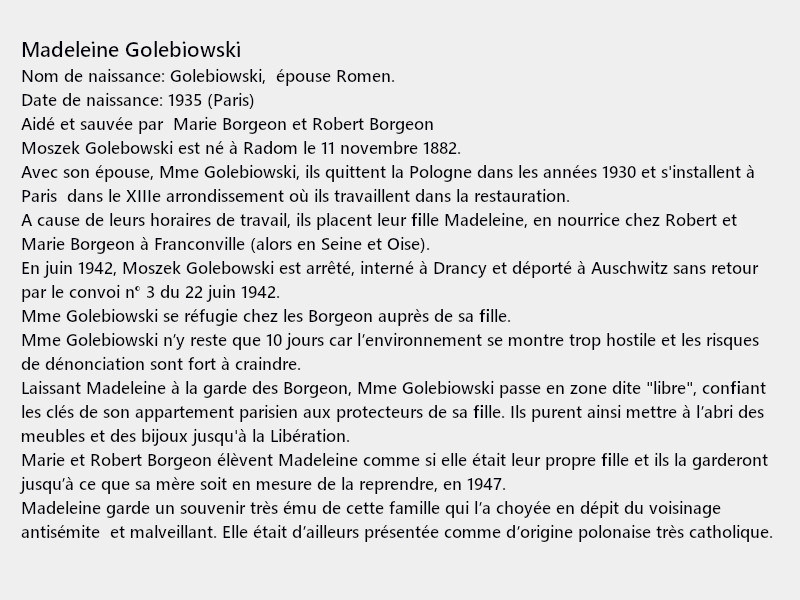 En juin 1942, Moszek GOLEBIOWSKI est arrêté, interné à Drancy et déporté à Auschwitz. Il ne reviendra pas. Sa femme part se réfugier chez Mr et Mme BORGEON. Son séjour sera de courte durée compte tenu de l'environnement très hostile en cette période.