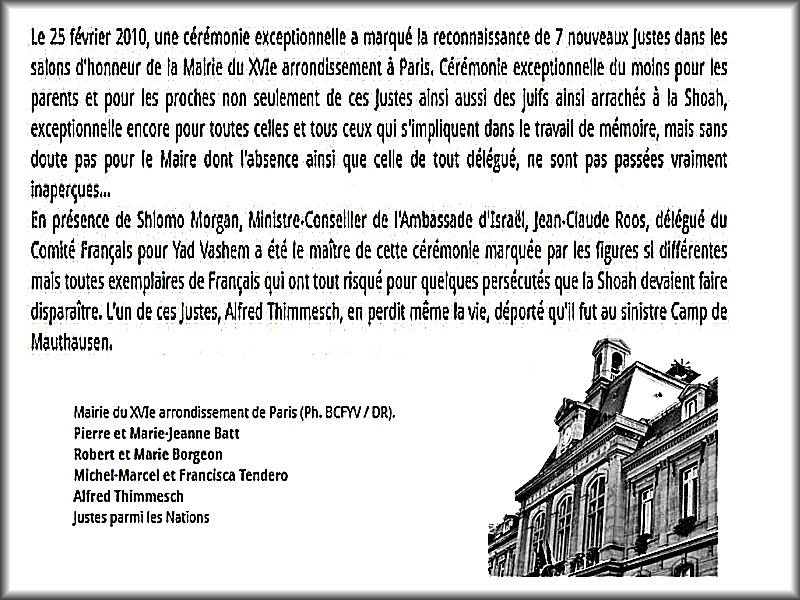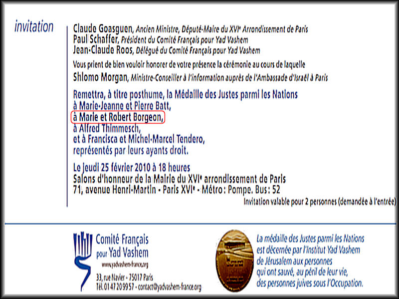 En février 2010, à la mairie du 15ème arrondissement de Paris, Robert et Marie BORGEON recevront à titre posthume la médaille des juste parmi la nation.