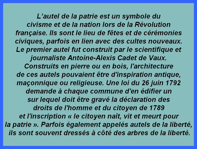 Le 19 décembre, la Société Populaire revendiqua les pierres tombales enlevées au cimetière et dans l’église, afin d’élever sur la place de la Liberté un autel de la Patrie . Une fois construit il y eut une cérémonie.