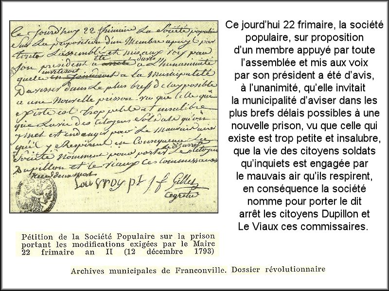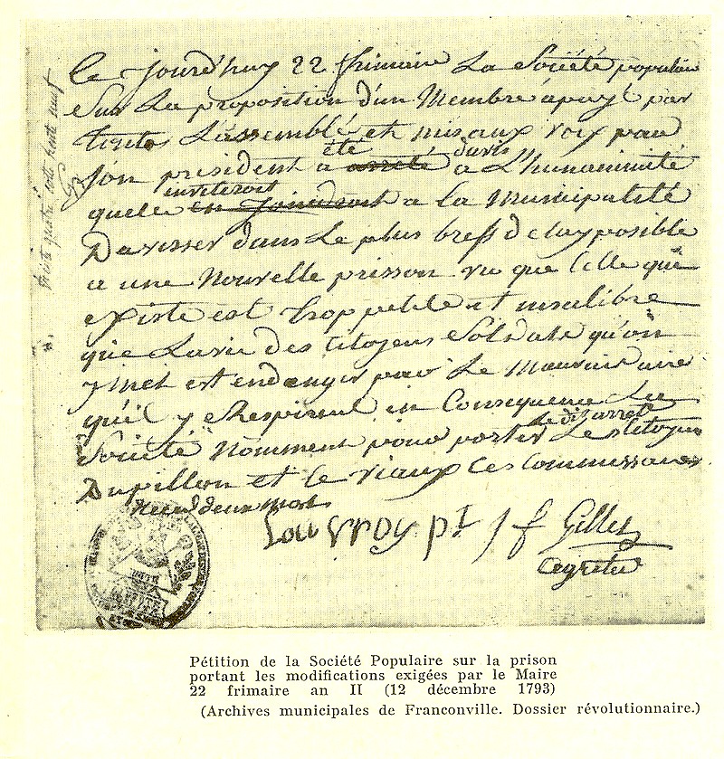 Le 12 décembre 1793, elle exigea une nouvelle prison. L'existante était trop petite et insalubre et servait de dépôt et de maison d'arrêt. Elle était située au rez-de-chaussée de la tour de l'ancien château seigneurial, devenu propriété nationale, confisquée à Anne-Léon, duc de Beaufort-Montmorency .